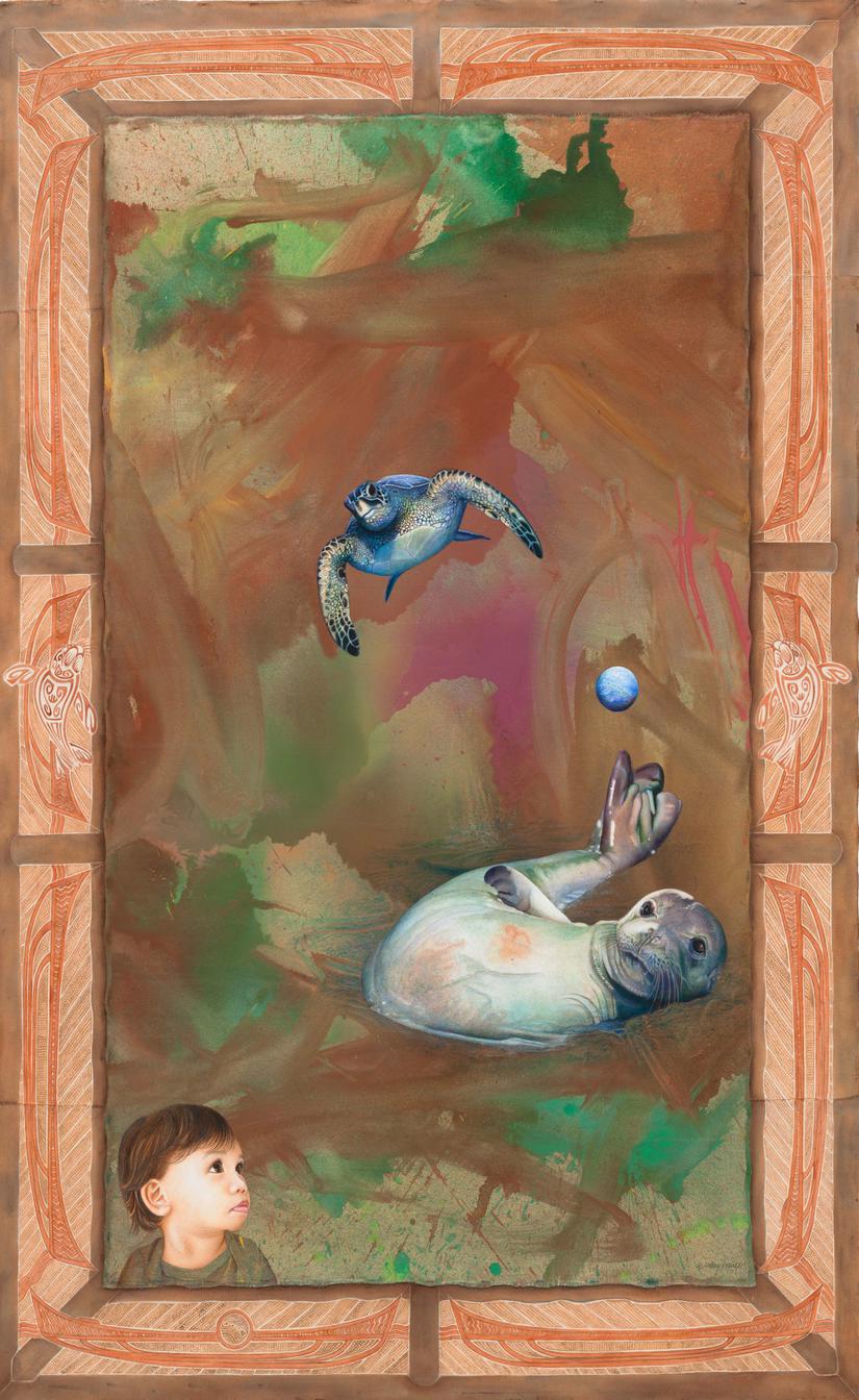 The painting reference photography of the Hawaiian Honu and the Hawaiian Monk Seal (Monachus schauinslandi,is by scientist and photographer, Chad Yoshinaga of the National Oceanic and Atmospheric Administration, Honolulu, Hawai’i. This giclee was printed by Paul McCormick in Hawai’i, and inspected, signed and numbered by Calley O’Neill.